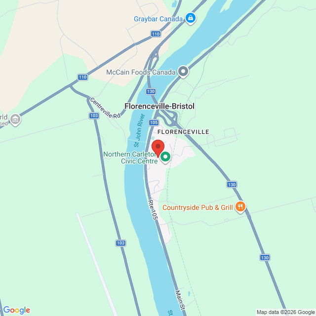 Florenceville, NB down town. Turn on McCain st from Route 105. The building is on your Right. It is beside the Winery. There is lots of parking. There are stairs inside the building to climb.